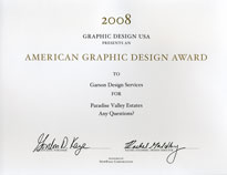 Awarding Organization: ![]() www.gdusa.com Other GDS awards from same 2008 competition: • Feather My Nest • Paradise Valley Estates • Solano County Bar Association • Click here for Press Release • Click here for viewer response • Click here for Press Coverage Design Firm: Garson Design Services, Fairfield CA Client: Paradise Valley Estates - Patti Luccioni, Sharon Dominick, Ron Ridley Title: Any Questions? Art Director: Steve Garson Designer: Steve Garson The Award Larger