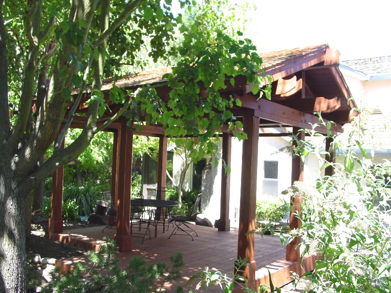 A truly wonderous placed to escape. A *Three-Rivers flagstone patio and pool deck, a swimming pool, a redwood patio cover, a portable spa with a redwood arbor to match the patio cover, and a little wooden bridge to get to your spa. (Photo below) |