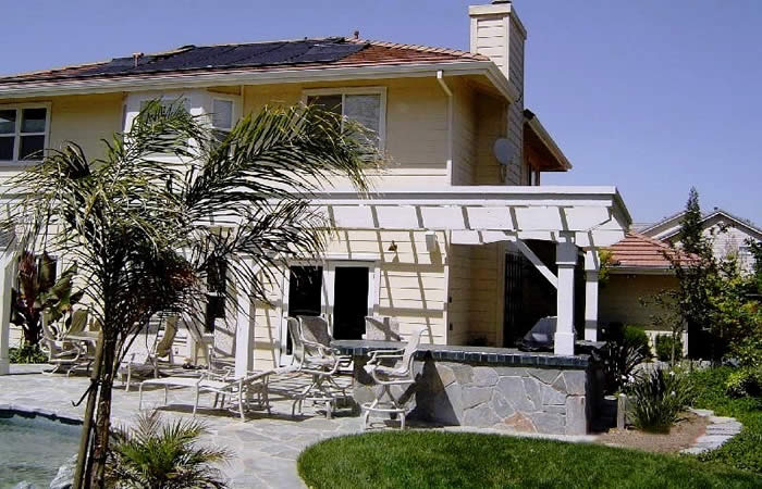 Solar heating pipes and panels have also been cleverly hidden atop the wood pergola. |