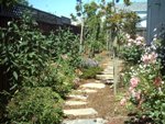 This quaint little Quartzite flagstone path leads down the side of the building, to the raised waterfeature. Talk about a nice spot to take your breaks; soon these plants will gently fall onto the edges of the path and the shade will offer shelter from the sun, all while listening to soothing sounds of water. |