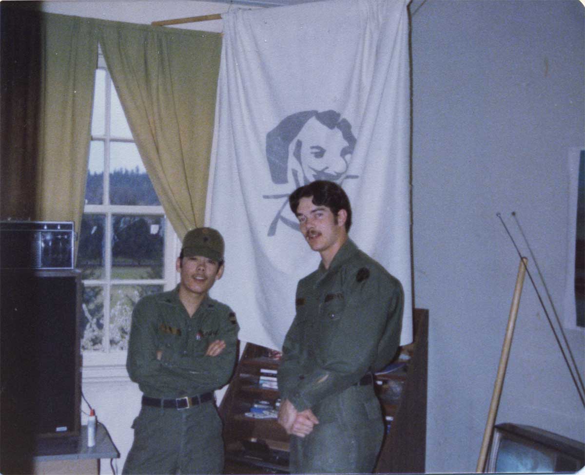 { Barracks life wasn't too bad - like animal house actually. "Health & Welfare" inspections were kinda scary but know biggy in the this volunteer army times. ![]() Kevin O'Keefe and Steve Garson. I did the Zig-Zag man Info artwork for Kevin to get dibs on his room - the best in the barracks. Needless to say I got it later that fall(?). ![]() Andy's stereo closeup. ![]() Andy and my My Speakerlab speaker. ![]() Steve and Andy. } |